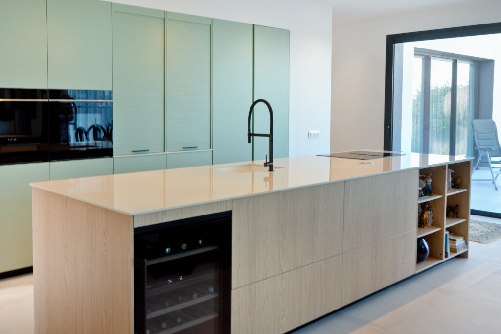 En este proyecto, la cocina se concibe como un espacio amplio y luminoso que se integra de manera natural en la arquitectura de la vivienda. El mobiliario en un tono verde suave aporta personalidad al conjunto sin perder la sensación de calma y equilibrio, creando un ambiente contemporáneo y muy luminoso. La composición se organiza […]